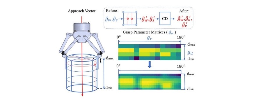 张教授团队近期提出了一种抓取姿态检测框架,利用深度神经网络生成丰富的全向(六自由度,“6-DoF”)高精度抓取姿态。为识别待抓取物体,研究采用卷积神经网络(CNN)分析多尺度圆柱体模型,获取物体位置和尺寸的详细几何信息。多个多层感知器(MLP)可优化机械臂的精度参数,包括夹持器宽度、特定平面旋转角度和夹持深度下的抓取评分,以及碰撞检测。这些参数被输入到框架内的算法中,将预设配置扩展为适应场景的全面抓取姿态。