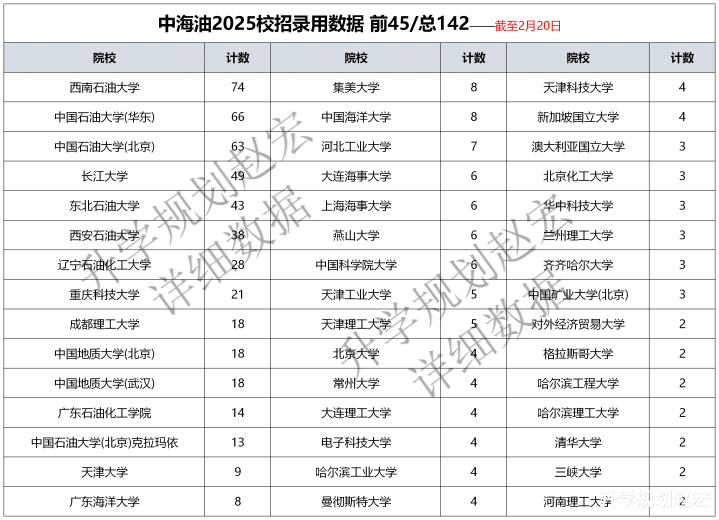 三桶油这两年比较火爆,原因还是大家想求稳,导致相关院校分数上涨。前面咱们写了中石油、中石化和国家管网2025校招录用数据,其实还有中海油,不过中海油的录用名单不好找,所以数据不全,虽然数据有限,但不影响咱们对录取数据的分析。三桶油的录取数据,其实都大同小异,另外要注意单位比较多,大家要关注不同单位的差异和发展,整体数据只是表象。那本文咱们就来看看中海油2025校招录用数据,目前只收集到5个单位录用情况,总共718人,人数最多的是西南石油大学,研究生占比50%左右。大家可以结合中石化和中石油的数据去做对比分析。具体看下文