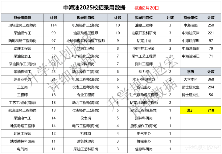 先来看看招录单位,总共718人,中海油服250人,中海油天津分公司221人,中海油深圳分公司97人,中海油海南分公司79人,中海油湛江分公司71人。学历上,大学本科368人,硕士研究生294人,博士研究生56人,整体趋势,研究生占比会超50%,这个比例和中石化中石油整体差不多,不过未来这个比例还会增加。岗位上,现场业务工程师岗114人,然后是采油操作工99人和陆地科研工程师岗97人,接下来是助理工程师41人和采油仪表工27人。不同单位的岗位名字有点差异。