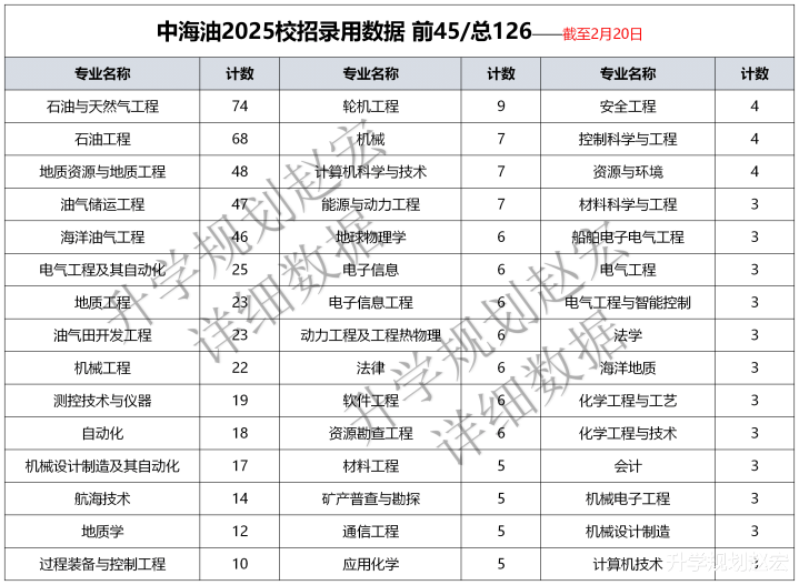 再来看看专业情况,人数最多的是石油与天然气工程74人,然后是石油工程68人和地质资源与地质工程48人,接下来是油气储运工程47人和海油油气工程46人。排在前面的专业也非常明显,除了行业强相关以外,还有电气、机械、自动化、计算机、电子信息等等专业。同样这些专业也是近两年非常火爆。报考的时候要小心,容易出现预留分数不够,然后被调剂的情况。另外对于咱们想要走这些行业,那么专业选择要小心,千万不能选错,或者有备选方案。如果走错了,后续转专业能不能非常关键。